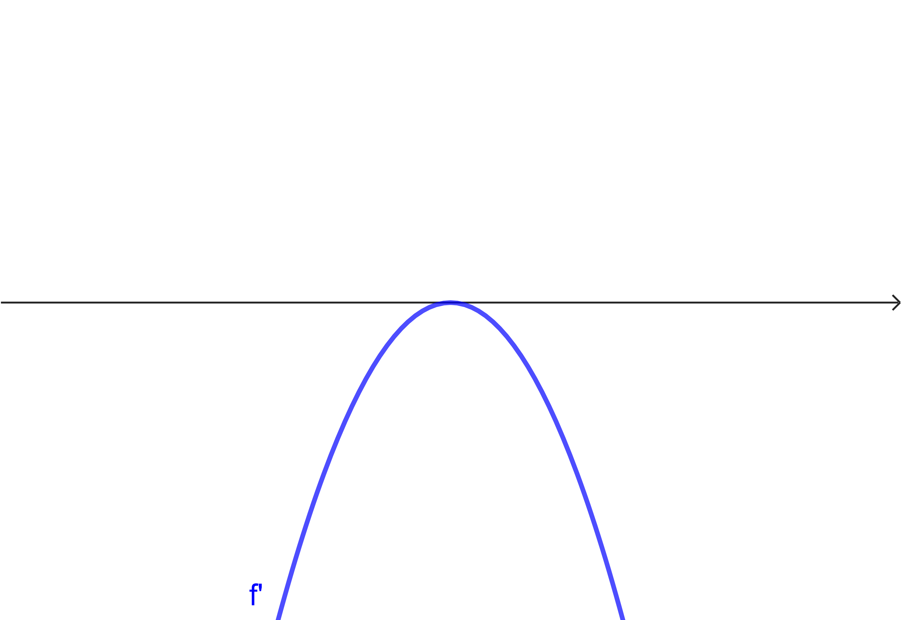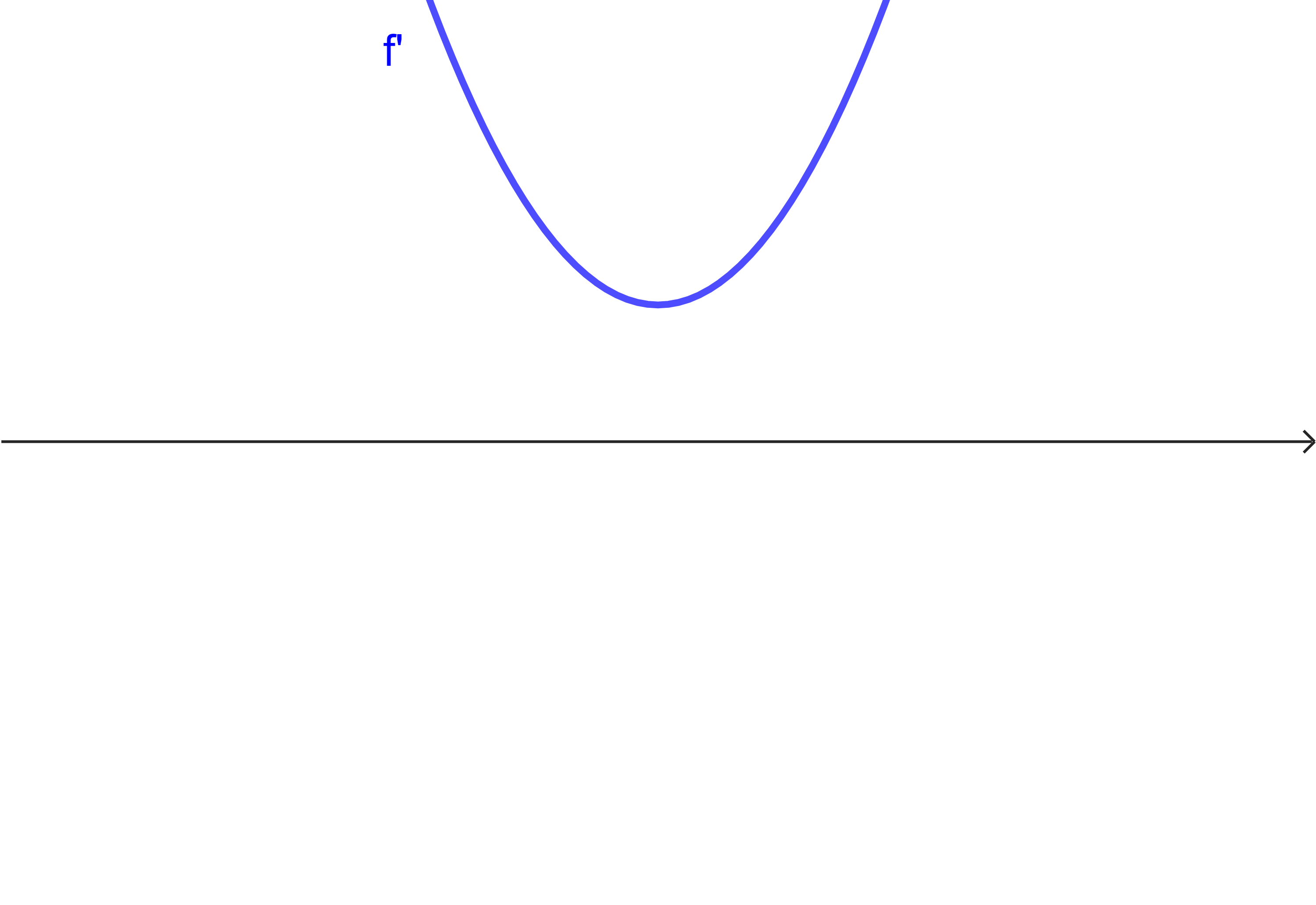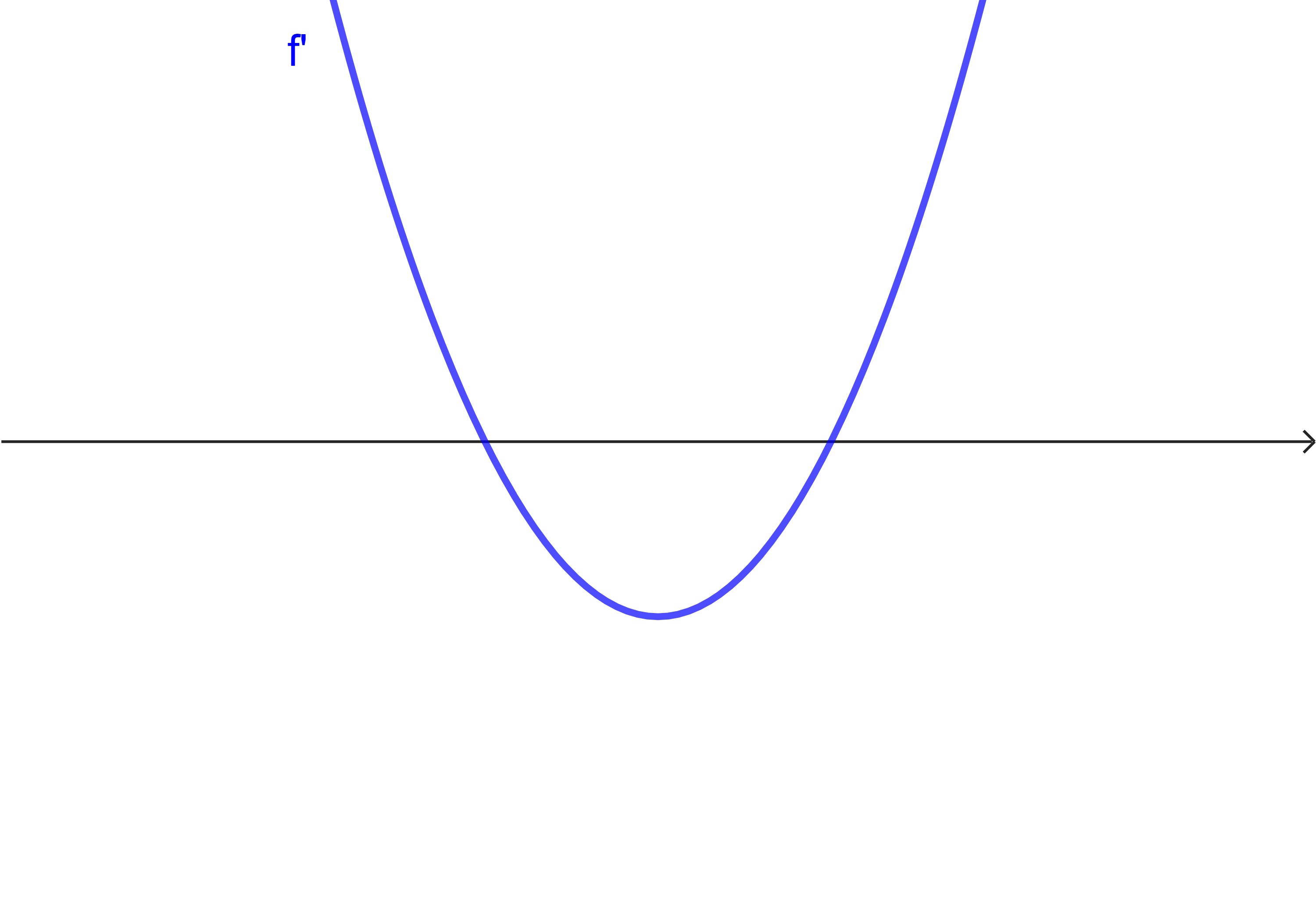 (c) Kontrolliere deine Ergebnisse mit dem Applet. Mit dem Schieberegler im unteren Fenster kannst du Graph $f'$ variieren. Zusätzlich kannst du den Scheitelpunkt der Parabel nach oben und unten bewegen. Es ergeben sich hierdurch verschiedene Typen von Graphen. Die $y$-Achse wurde im Applet weggelassen, da sie für die Argumentationen keine Rolle spielz. Mit dem Punkt im oberen Fenster kannst du die Lage der $x$-Achse variieren. Auch diese Lage spielt für die Argumentationen hier keine Rolle.